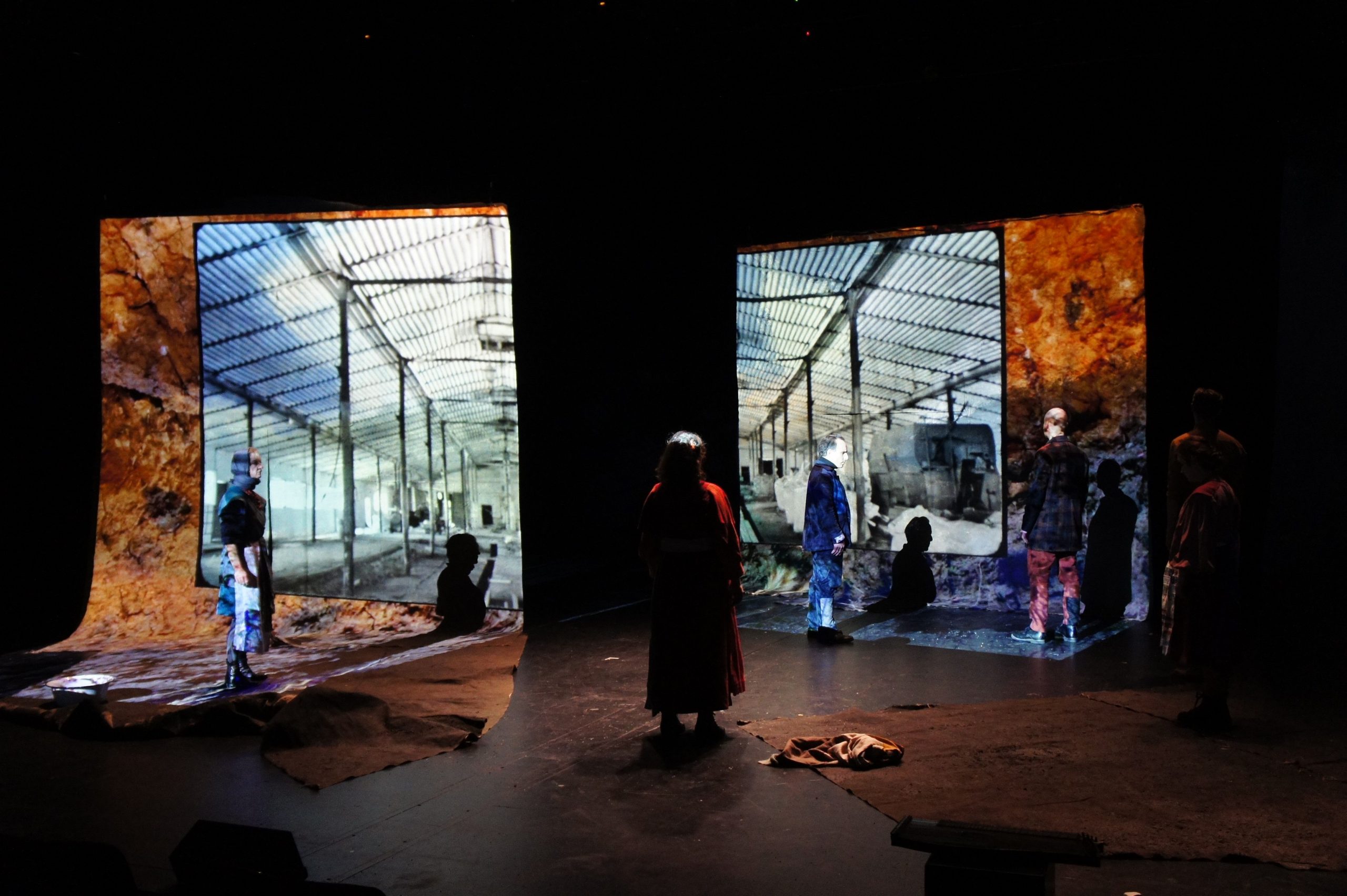 Mit: Oleksii Dorychevskyi, Stefko Hanushevsky, Anja Jazeschann, Stefan H. Kraft, Valerij Lisac, Jörg Ritzenhoff, Mariana Sadovska, Yasia Sayenko | Künstlerische Leitung: André Erlen, Stefan H. Kraft | Regie: André Erlen | Bühne & Kostüm: Michaela Muchina | Video & Live-Kamera: Valerij Lisac | Live-Musik: Mariana Sadovska, Jörg Ritzenhoff, Yasia Yenko | Produktionsleitung: Theresa Heussen | Künstlerische Mitarbeit: Pavlo Yurov | Licht: Jürgen Kapitein | Dramaturgie: Lea Goebel | Spielfassung: Ensemble | Regieassistenz: Regina Bensch, Patricia Stoevesand | Dramaturgieassistenz: Gemma Mathilda Heinen | Übertitel: Andrew Clarke (PANTHEA) | Foto: Ana Lukenda