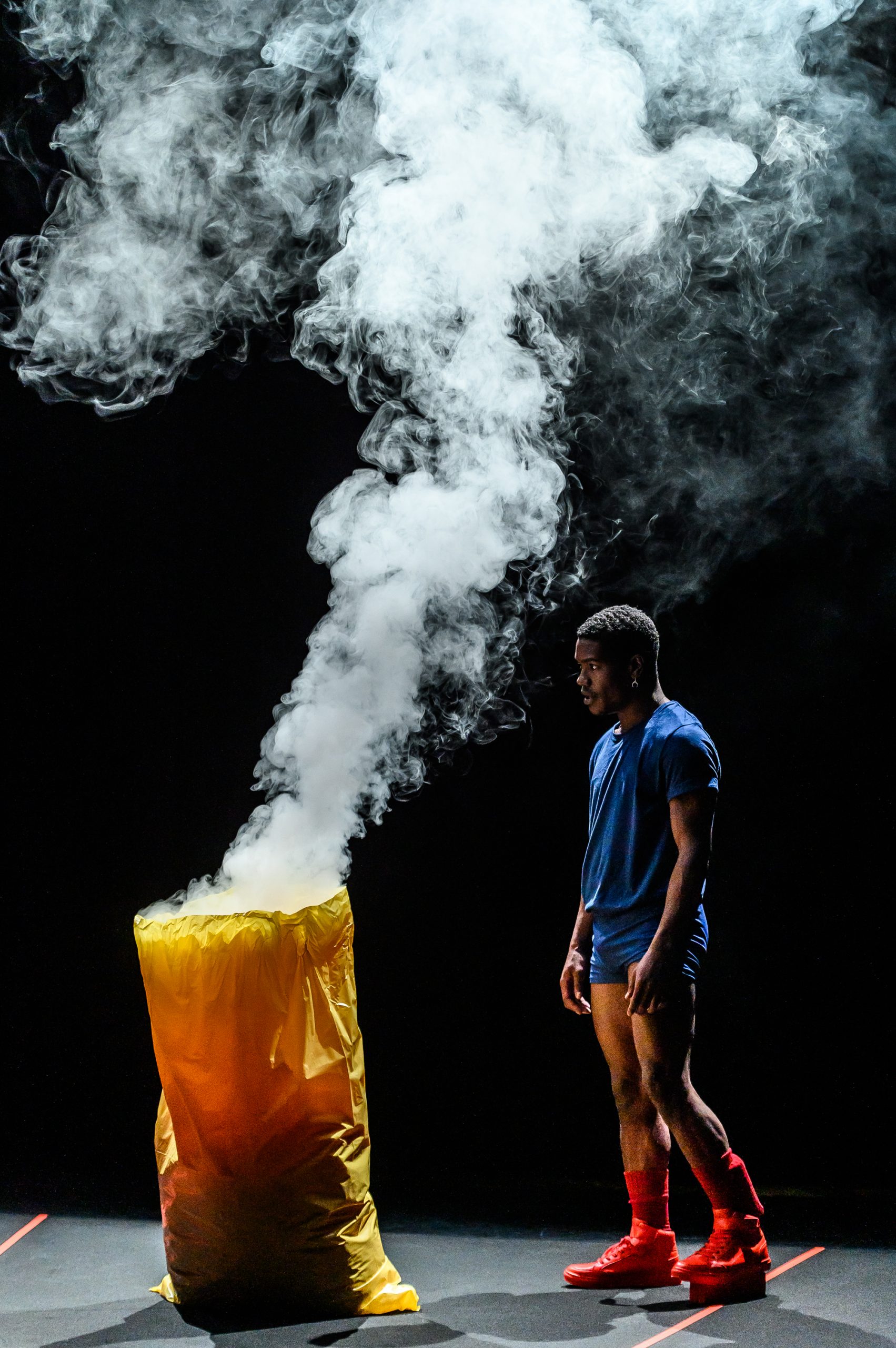 Dieser Traum, dessen Held wir sind, beginnt in der Dunkelheit. In einer fiktiven Landschaft entsteht eine kollektive Vorstellungswelt. Im Süden, Osten und Norden, hinter den Mauern des Theaters, befinden sich Wissenschaftsgebäude, Fabriken, das Meer und andere Kontinente. Der Westen läuft durch unser Fleisch, unsere Organe, unter unseren Füßen befinden sich Kabel, Fossilien und Felsen, und über unseren Köpfen tut sich alles auf, was sich in der Stratosphäre bewegt, von Scheinwerfern bis zu schwarzen Löchern. Eine Figur auf dem Dachboden spielt mit dem Feuer und verdampft, ein Aufzug komprimiert die Gruppe zu einer einzigen Masse, die in einem hundertjährigen Garten landet. Aus einem Körper, der für lange Zeit in einer Plastiktüte verschwindet, entspringt ein Tanz aus den Abgründen eines Clubs oder aus der Phantasie eines Schamanen. Dream is the Dreamer ist konzipiert für einen Performer und drei Plastiktüten. Zwischen Anthropozentrismus und Posthumanismus, atomarer Welt und Ökologie bewegt sich die Science-Fiction-artige Performance.
