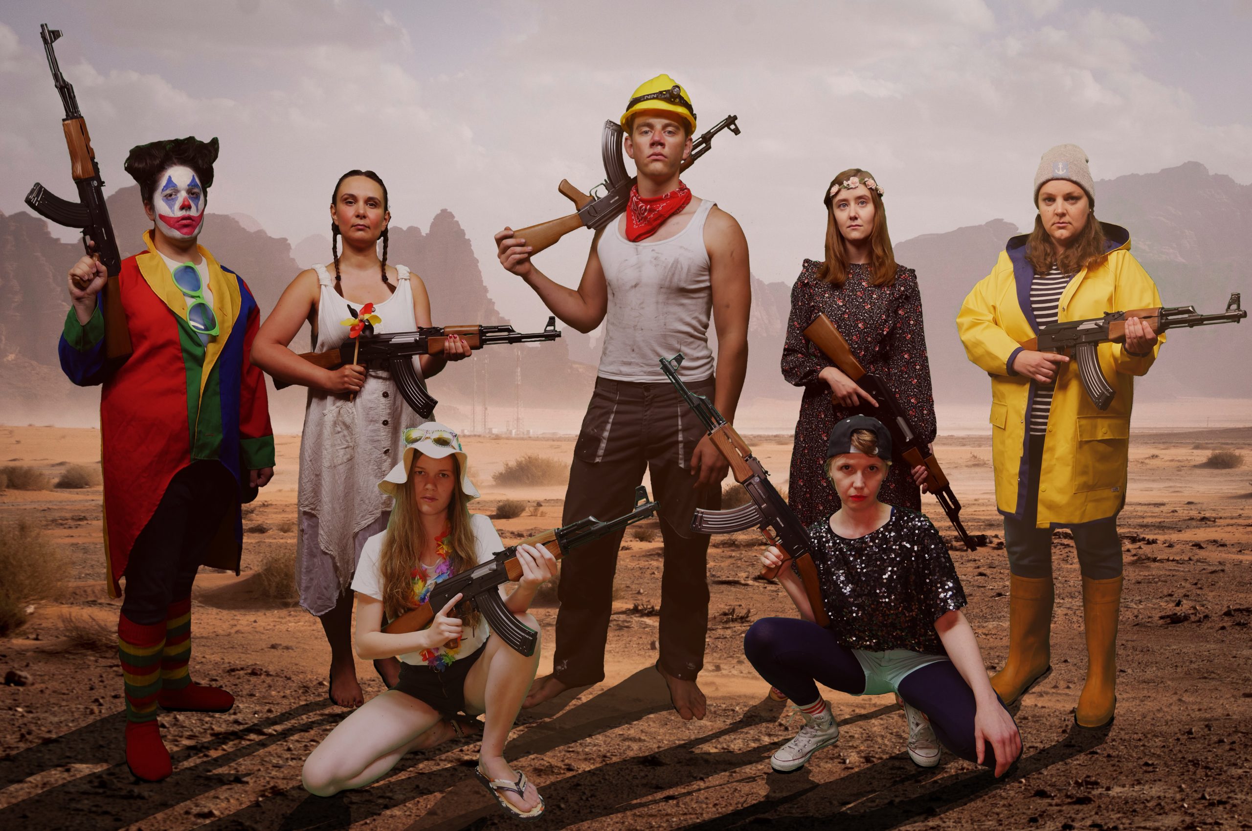Das Diplomsemester 2022 der Theaterakademie Köln dreht in der Regie von Tim Mrosek Philipp Löhles Stück „FEUERSCHLANGE“ durch den postironischen Fleischwolf und garniert es mit eigenen Texten, pseudodokumentarischen Zitaten und schicken Plastikgewehren.