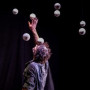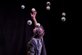 Eine Samm­lung wei­ßer Kugeln dreht sich, hängt, rollt, fliegt, dehnt sich aus, fällt in sich zusam­men und schwebt wie Pla­ne­ten­sys­te­me im Raum. Sand rie­selt aus unwahr­schein­li­chen Quel­len und schafft neue Land­schaf­ten auf dem Boden und einen gol­de­nen Dunst in der Luft. Durch all das bewegt sich ein Kör­per mit rast­lo­ser Absicht. Er ver­sucht, Ruhe und Gleich­ge­wicht zu fin­den in einem Raum, der nicht auf­hört, sich zu bewegen.