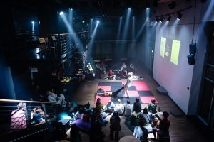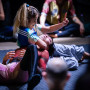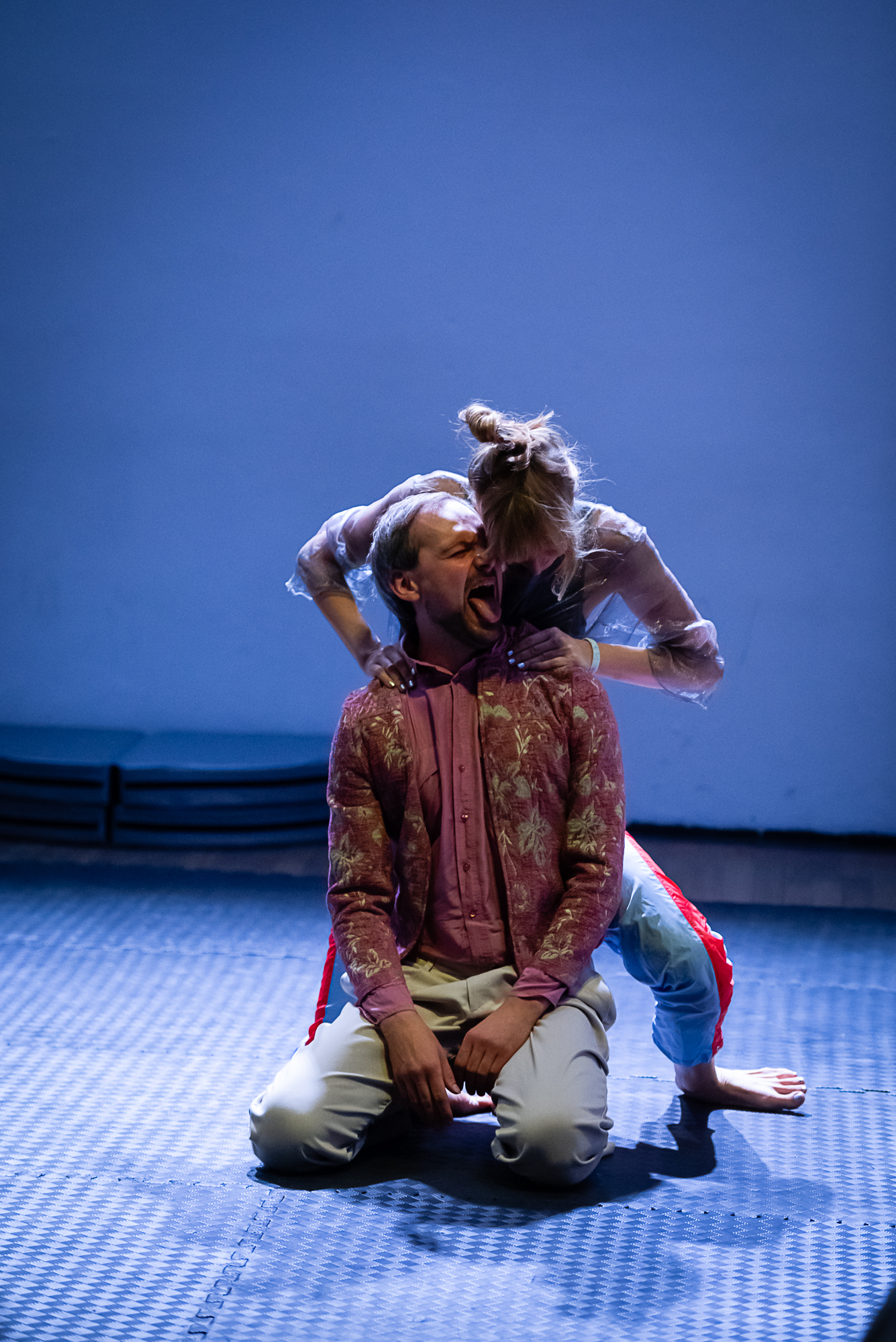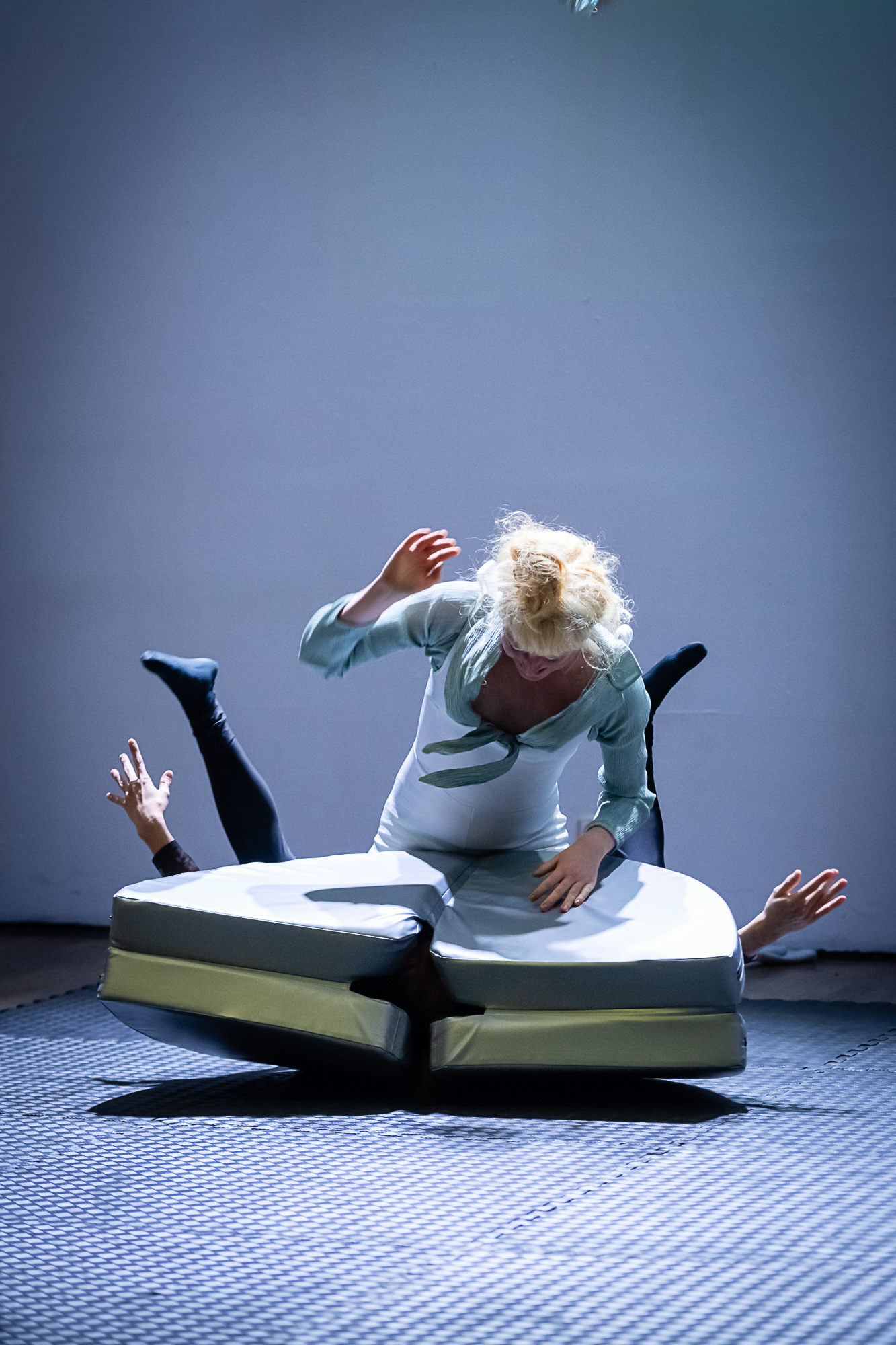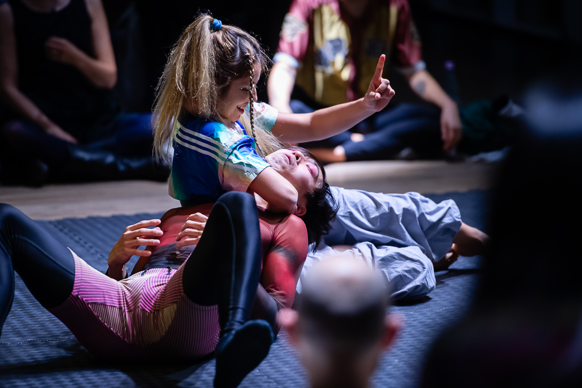 Das For­mat kon­fron­tiert Mitspieler:innen und Publi­kum auf spie­le­ri­sche Art und Wei­se mit kör­per­li­chen Gren­zen und bringt die Rau­fen­den in einen phy­si­schen Dia­log, in dem kör­per­li­che Gege­ben­hei­ten und selbst erdach­te Regeln vari­an­ten­reich ver­mischt wer­den. Was bewegt der phy­si­sche Dia­log? Wel­ches Wis­sen wird hin­ter­fragt? Wel­che ein­ge­üb­ten Denk­mus­ter und wel­che Mei­nun­gen wer­den aufs Spiel gesetzt?