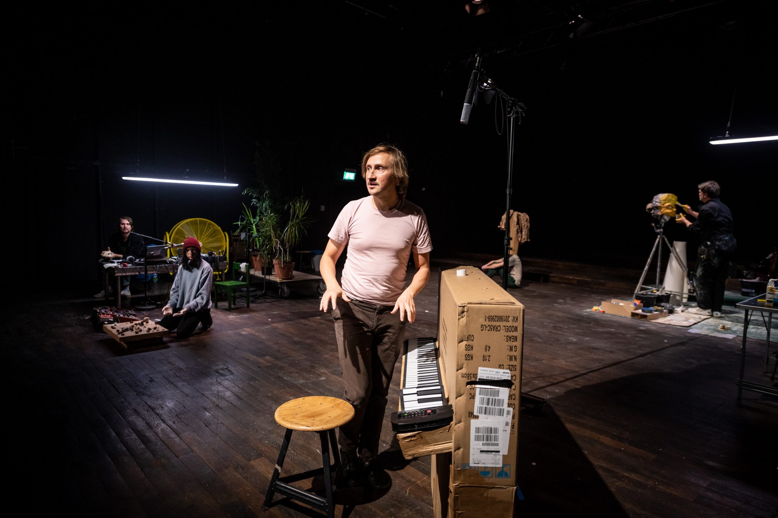 Per­for­mance und Musik: Finn Leon Cam, Kor­ne­li­us Hei­de­brecht, Svea Kirschmei­er, Mar­tin Kloep­fer und Oleg Zhu­kov – Dra­ma­tur­gi­sche Bera­tung: Nina Rüh­mei­er –Pro­duk­ti­ons­lei­tung: Nora Voll­mond – Manage­ment: Béla Bisom, transmissions