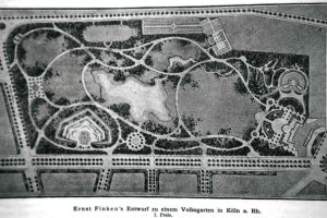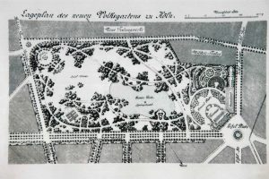 Es überrascht sicherlich nicht, dass es einer Stadt, die bisher auf engstem Raum auskommen musste, an Grünanlagen fehlte. Deshalb plante der Stadtbaumeister H.J. Stübben auch Parkanlagen ein. Die konkrete Umsetzung schrieb er allerdings als Architektenwettbewerb aus. Zwischen März und Oktober 1887 gingen 44 Entwürfe bei der Stadt ein. Umgesetzt wurde dann aber nicht der Entwurf des Preisträgers Ernst Finken, der stolze 2.000 Mark als Preisgeld erhalten hatte, sondern der von Adolf Kowallek. Kowallek war von 1887 bis 1902 Kölner Gartenbaudirektor, der nicht nur den Volksgarten anlegte.