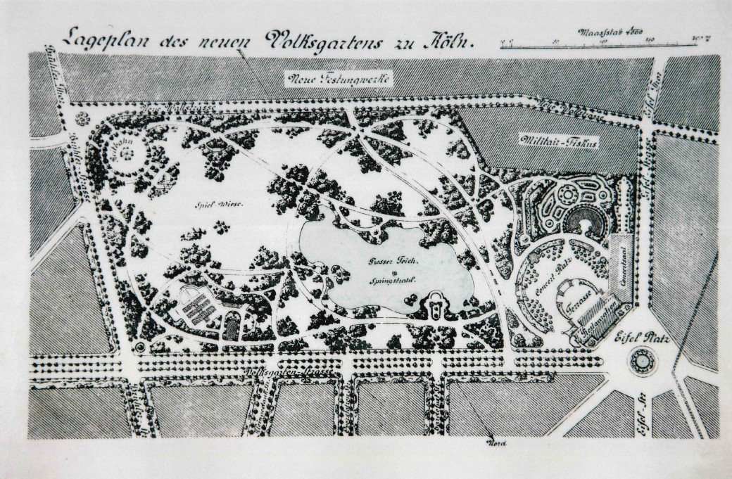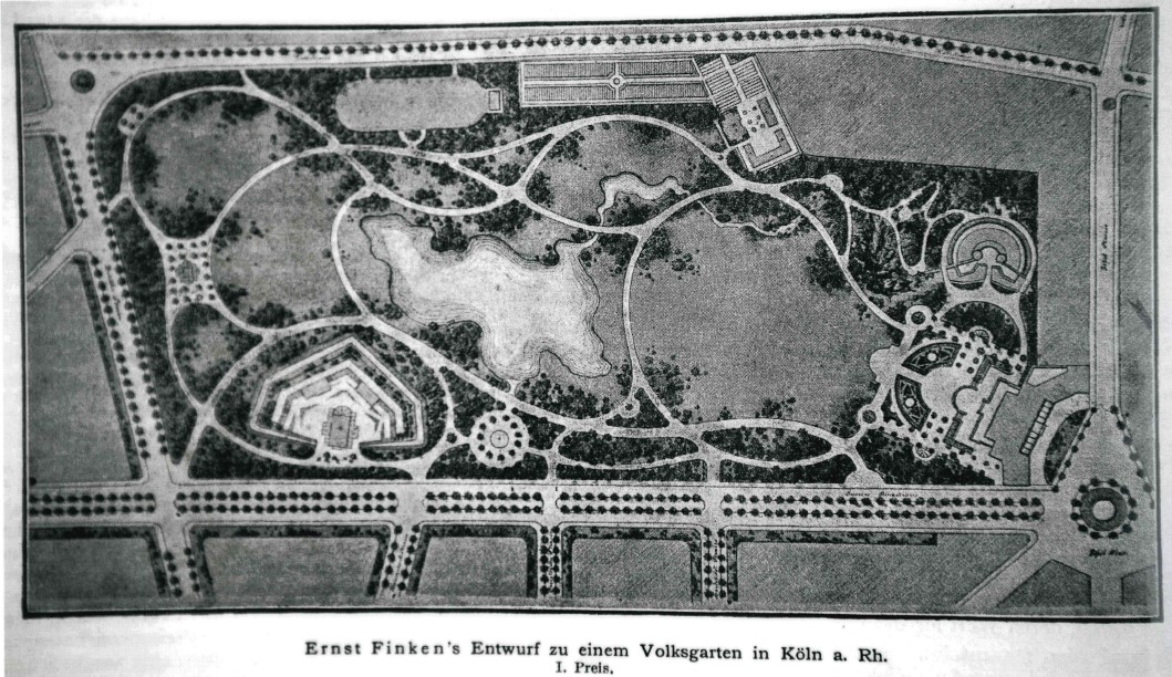Es überrascht sicherlich nicht, dass es einer Stadt, die bisher auf engstem Raum auskommen musste, an Grünanlagen fehlte. Deshalb plante der Stadtbaumeister H.J. Stübben auch Parkanlagen ein. Die konkrete Umsetzung schrieb er allerdings als Architektenwettbewerb aus. Zwischen März und Oktober 1887 gingen 44 Entwürfe bei der Stadt ein. Umgesetzt wurde dann aber nicht der Entwurf des Preisträgers Ernst Finken, der stolze 2.000 Mark als Preisgeld erhalten hatte, sondern der von Adolf Kowallek. Kowallek war von 1887 bis 1902 Kölner Gartenbaudirektor, der nicht nur den Volksgarten anlegte.